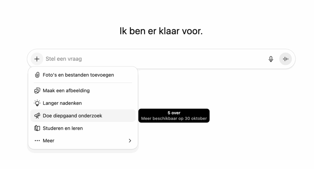 De agent is te gebruiken via de knop ‘Doe diepgaand onderzoek’ onderin het vraagvenster van ChatGPT.